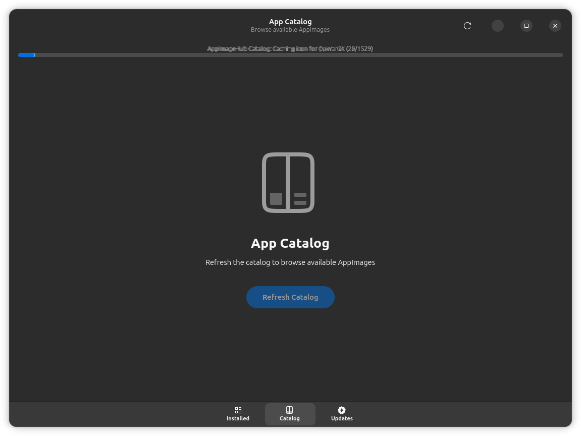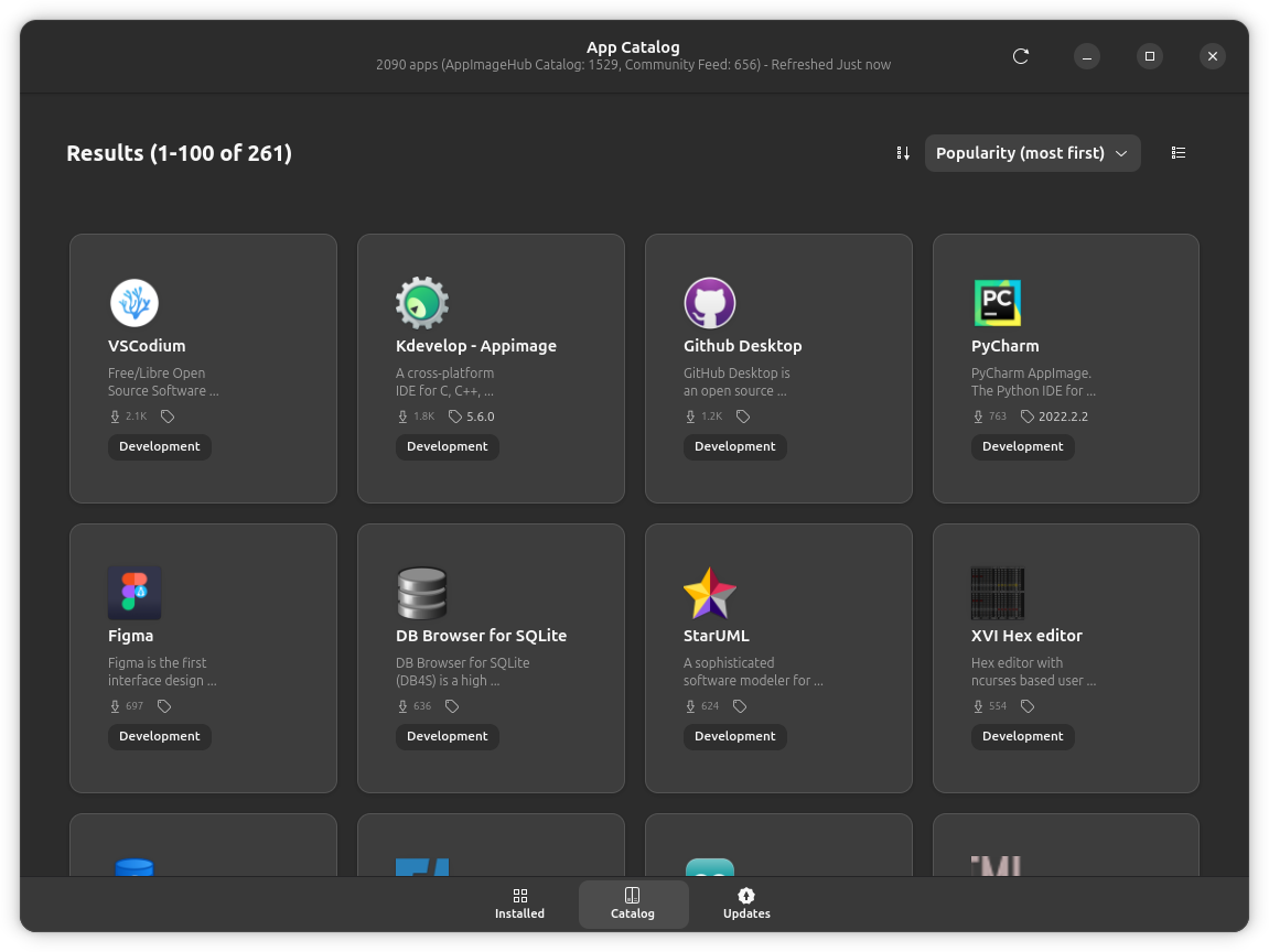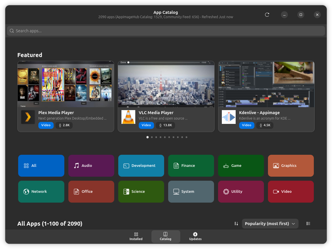 App Catalog with a featured apps carousel, category filters, and one-click install. Community-curated from AppImageHub and community feeds. Search, sort by popularity, and preview screenshots before installing.