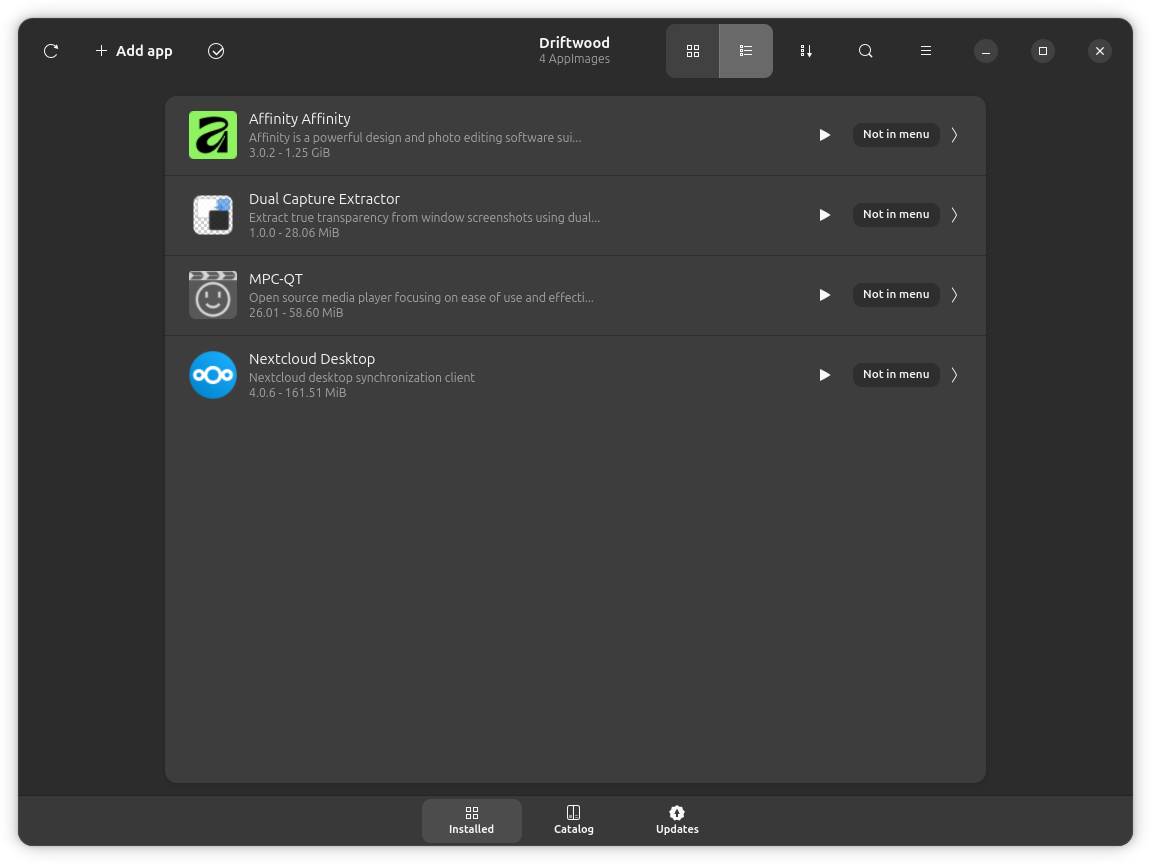 Grid and list views, search, sort, custom tags, and batch selection. See every AppImage at a glance - versions, sizes, descriptions, and integration status. Add apps by scanning folders or dragging files in.