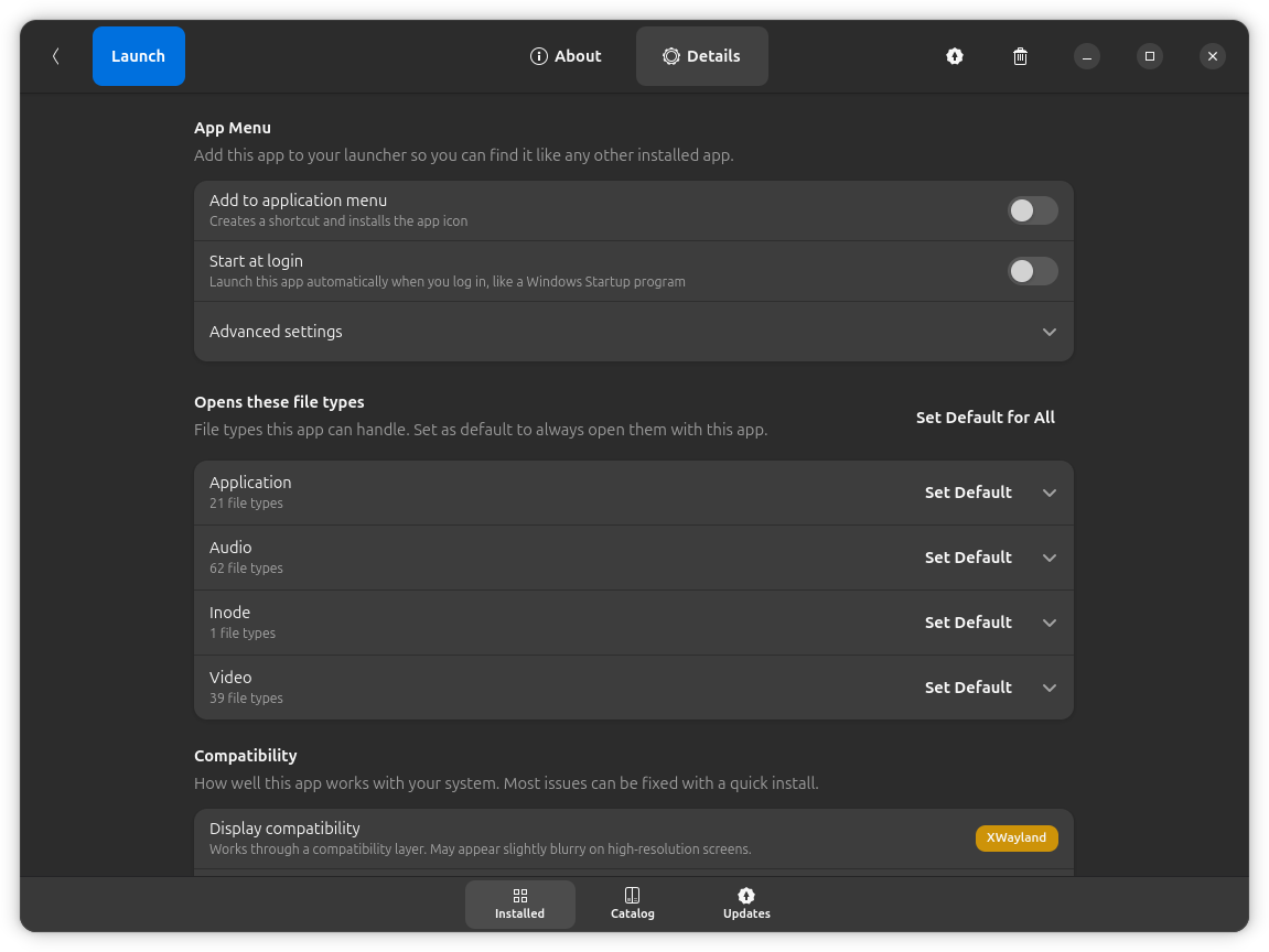 Add apps to your application menu with one toggle, set autostart, configure file type associations, and manage launch arguments and environment variables.