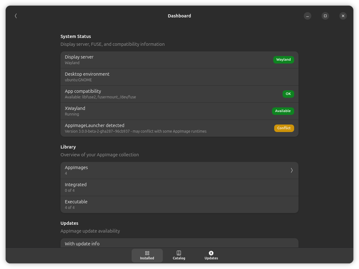Detect FUSE availability, display server (Wayland or X11), and potential conflicts. Guided setup for missing dependencies so you can fix issues before they bite.