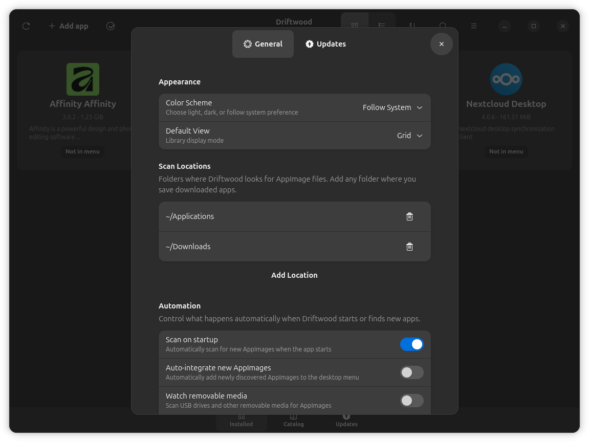 Light, dark, or system theme. Configure scan locations, auto-scan on startup, auto-integrate new apps, and watch removable media for AppImages.