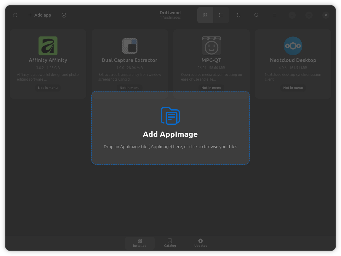 Drop an AppImage onto the window to add it instantly. Or click the + button to browse your files. No terminal, no chmod, no fuss.