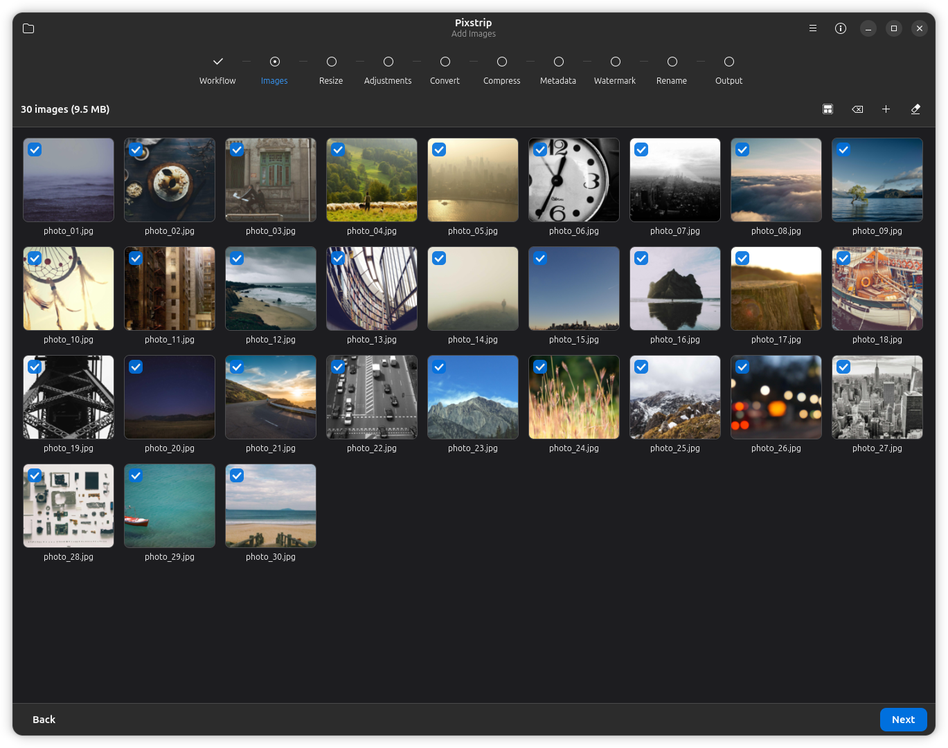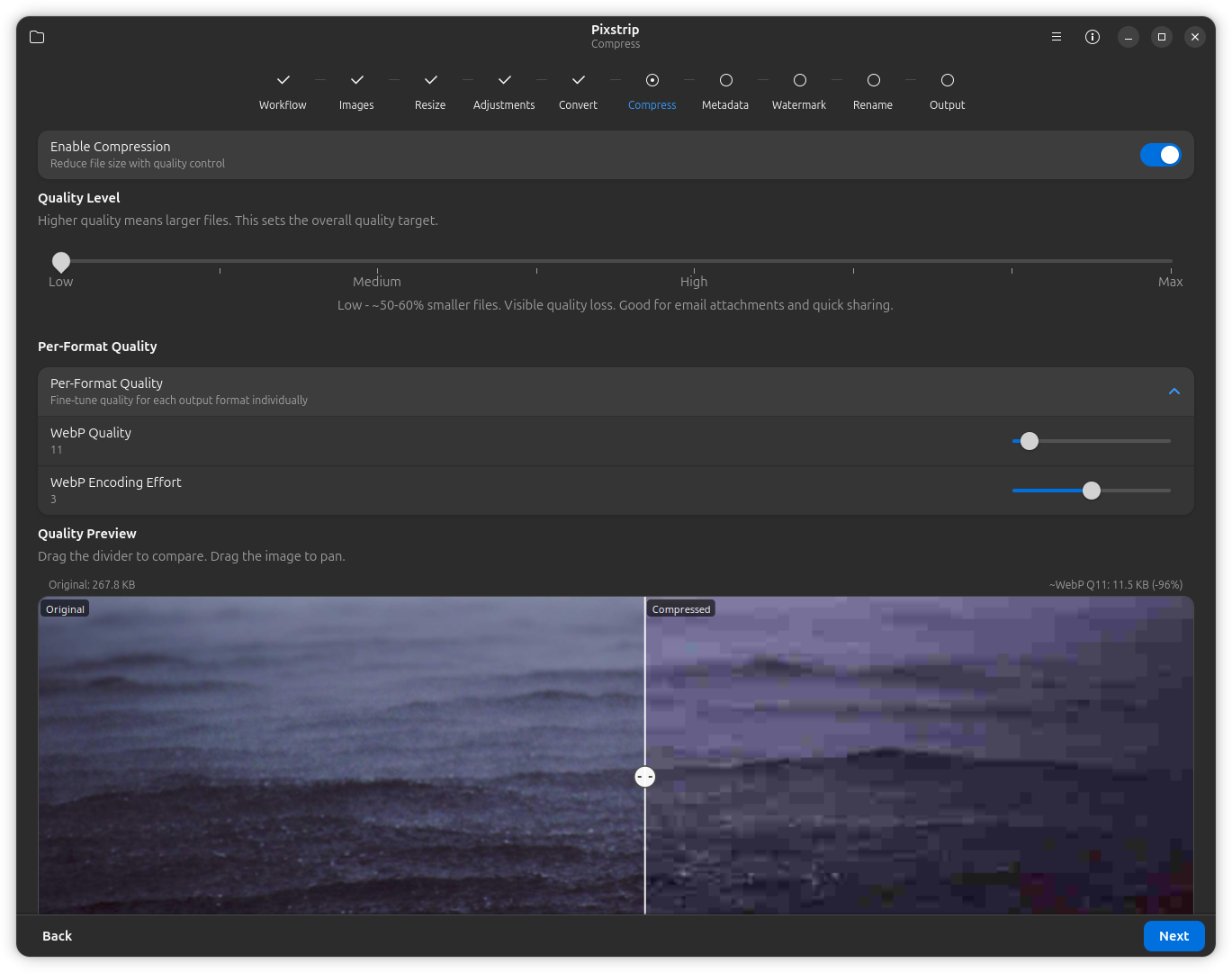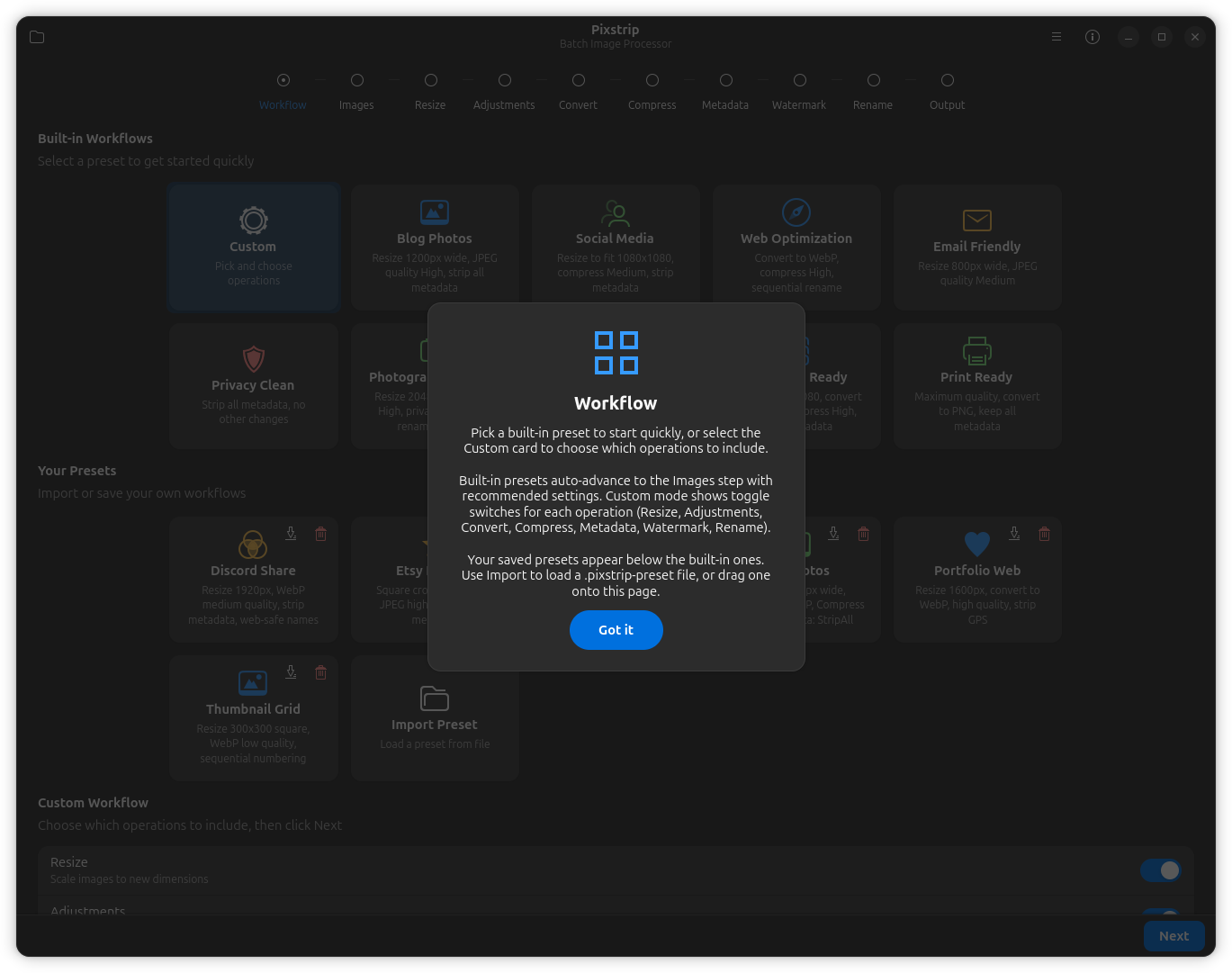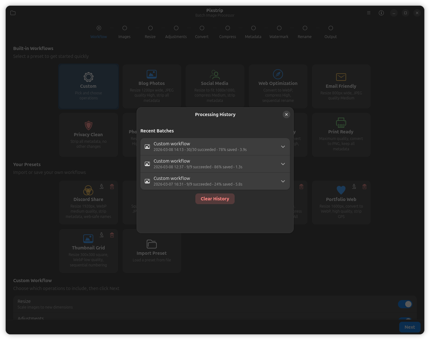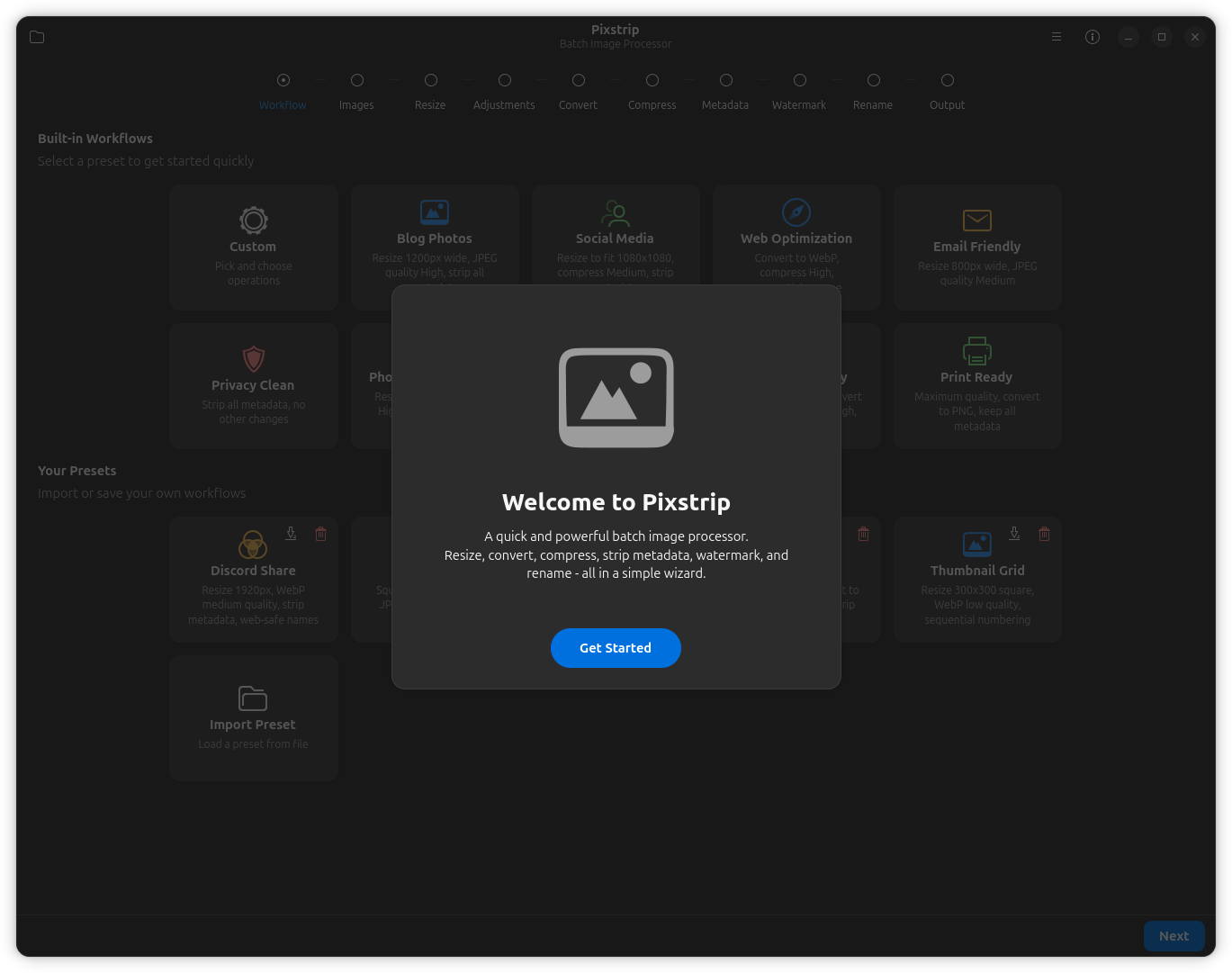 Resize, convert, compress, strip metadata, watermark, and rename - all in one wizard. Drop your images, pick a preset or build your own pipeline, and let PixStrip handle the rest.