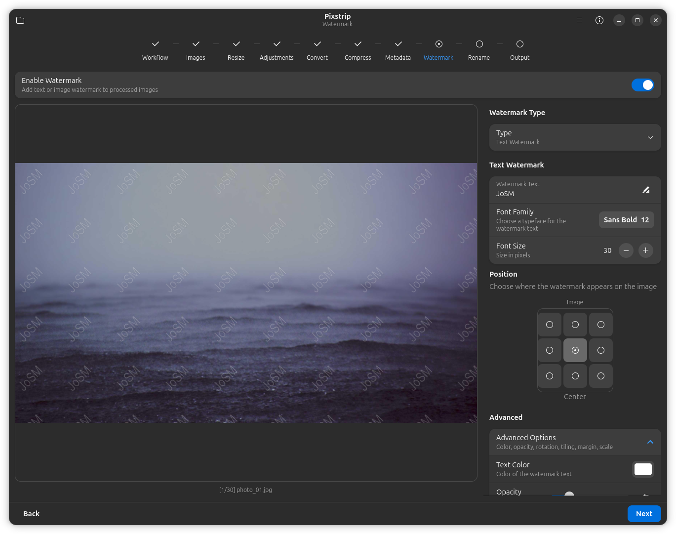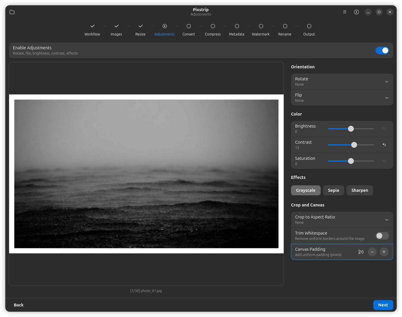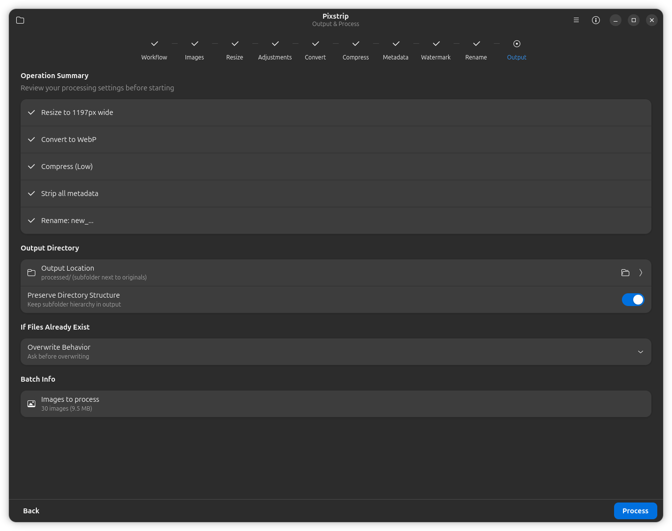 Walk through the wizard step by step. Resize, adjust, convert, compress, strip metadata, watermark, rename - enable what you need.