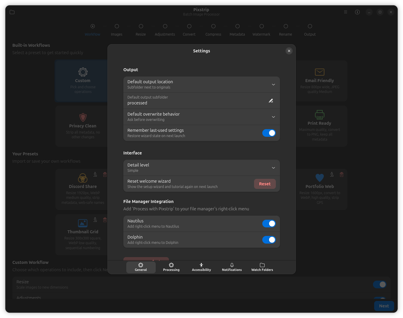 File manager integration for Nautilus, Nemo, Thunar, and Dolphin. Select images, right-click, and process with PixStrip.