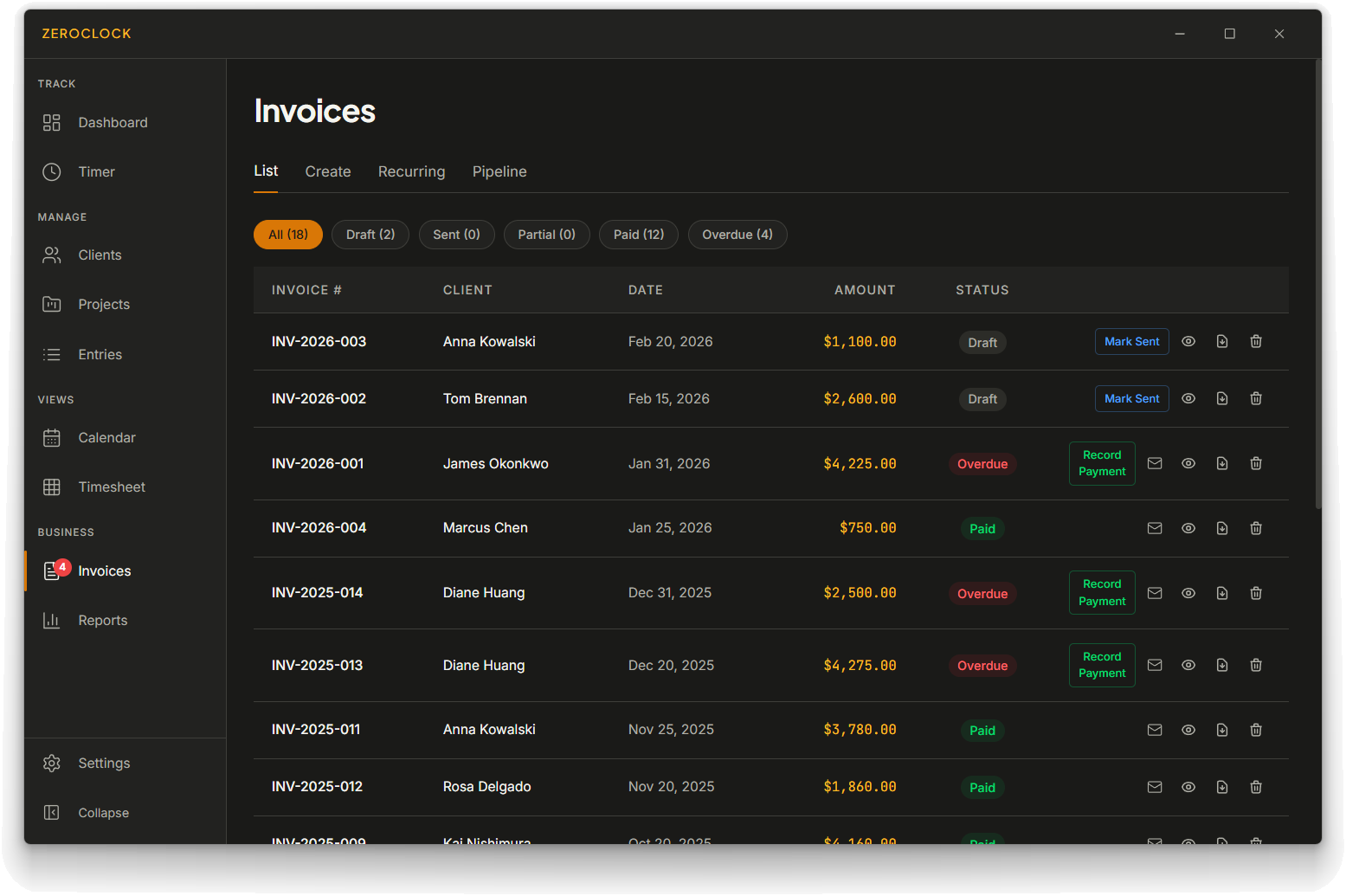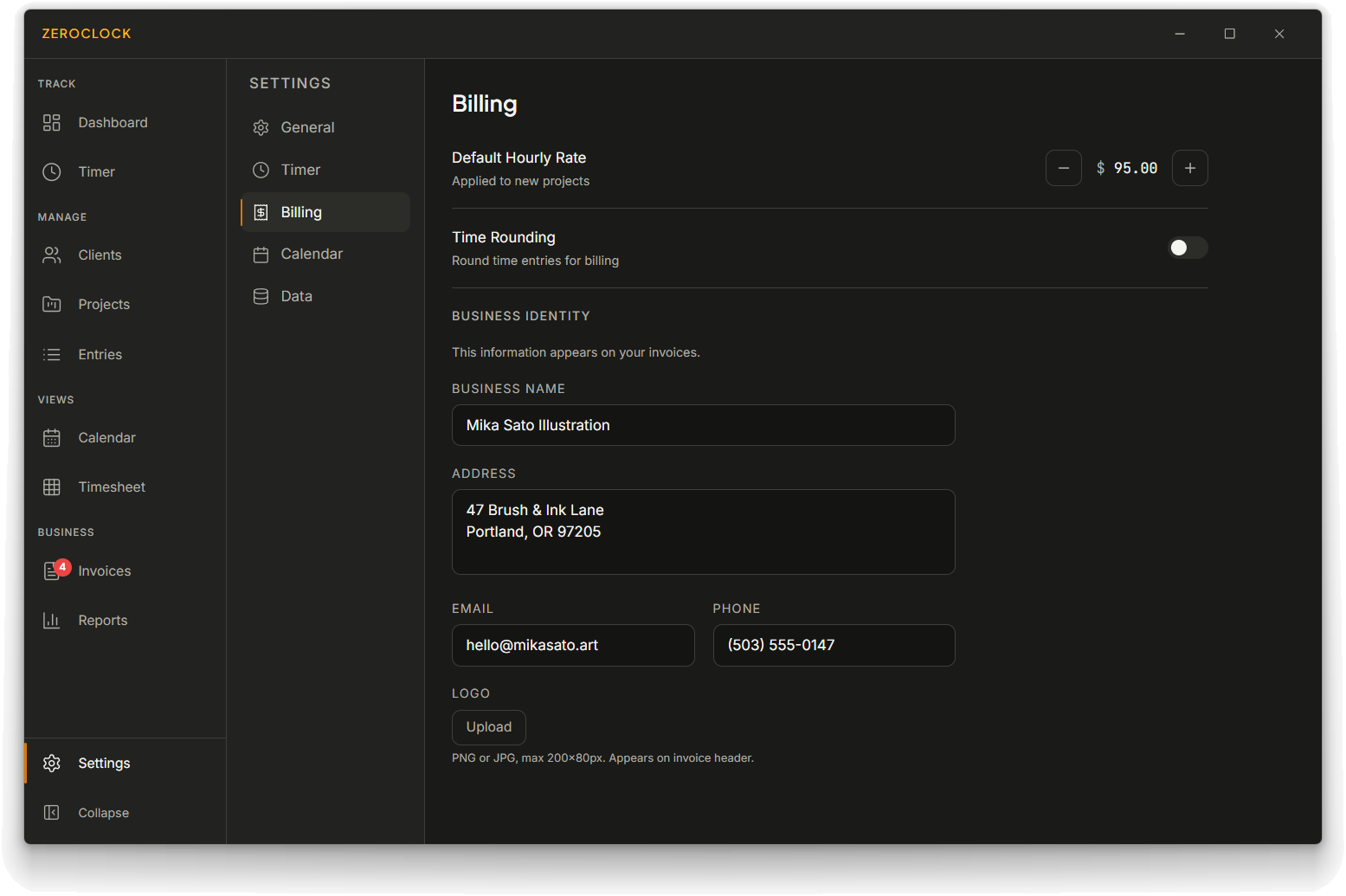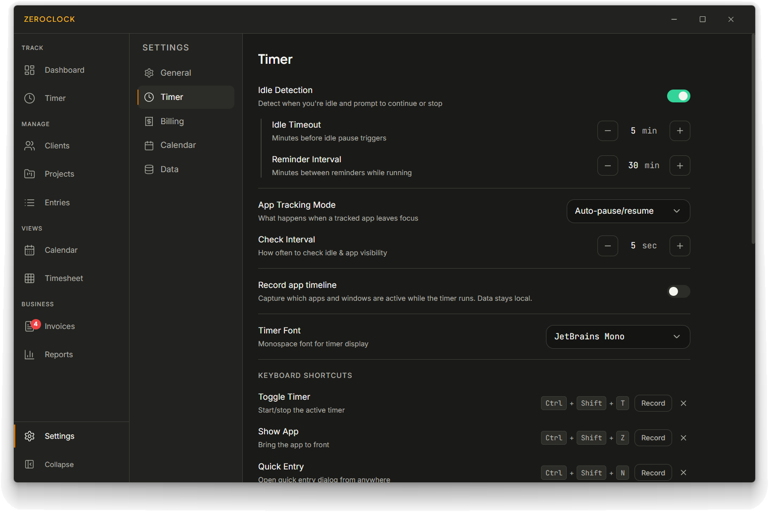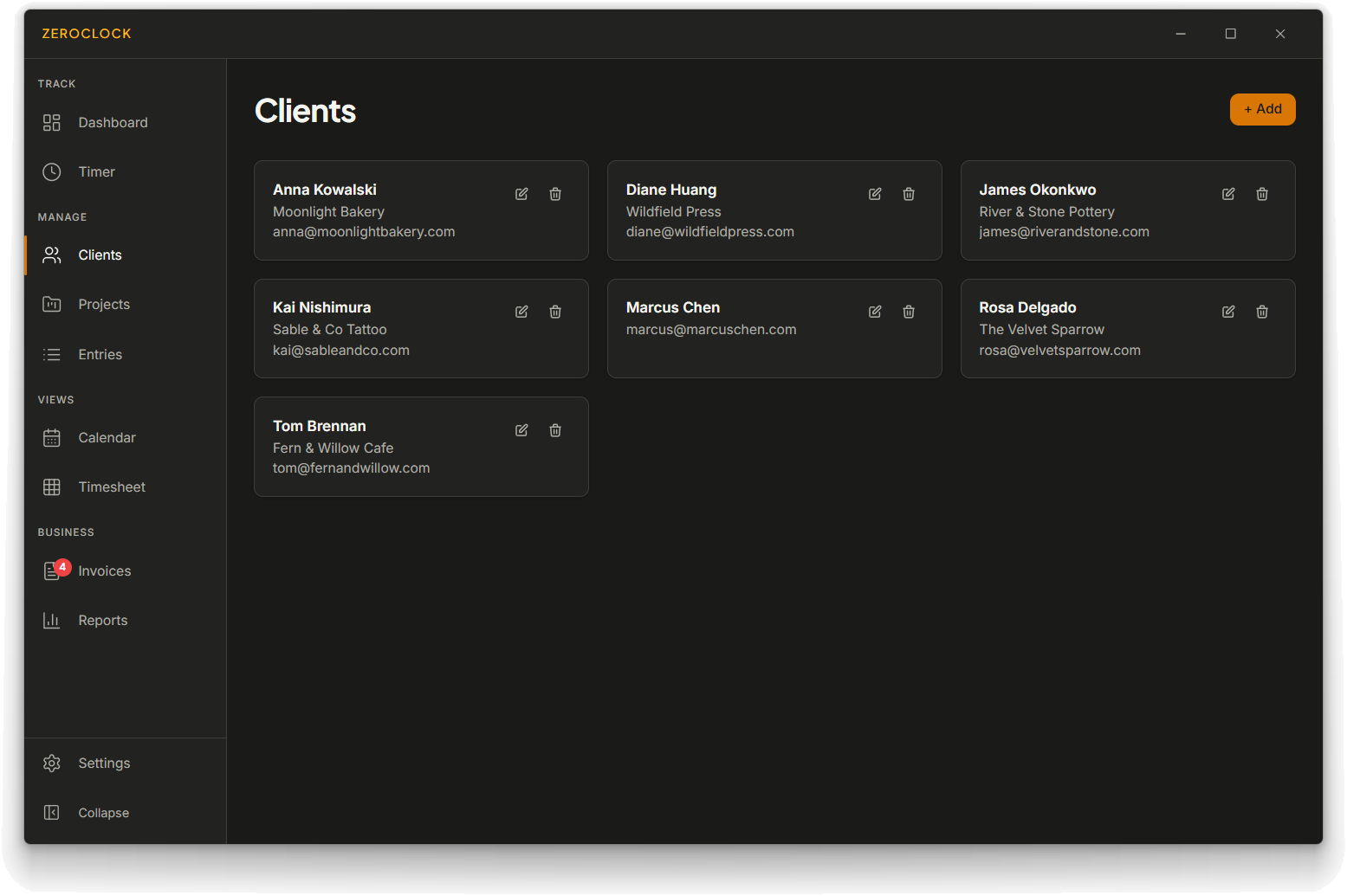 Time tracking shouldn't require surrendering your data to a platform that profits from it. ZeroClock keeps everything local - your hours, your invoices, your way.