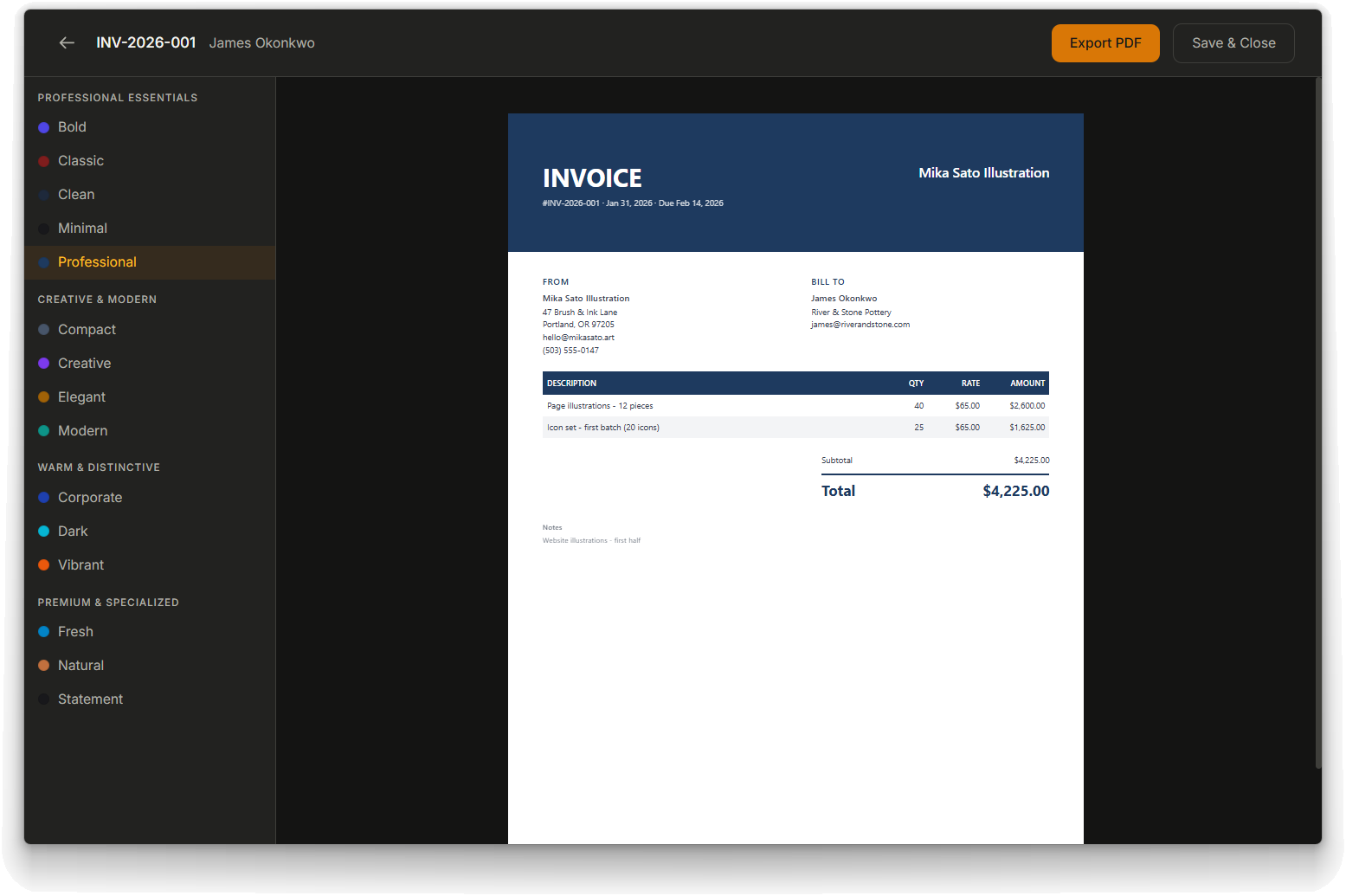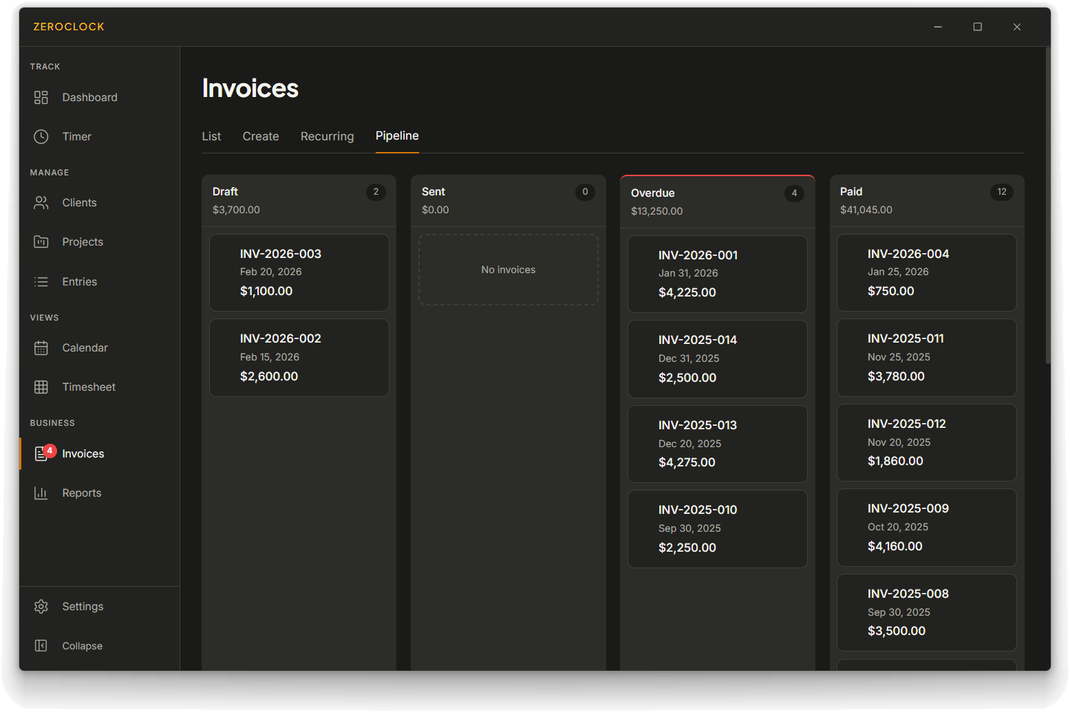 Turn time entries into professional invoices. Multiple templates, PDF export, recurring invoices, and a visual pipeline tracking draft through paid.