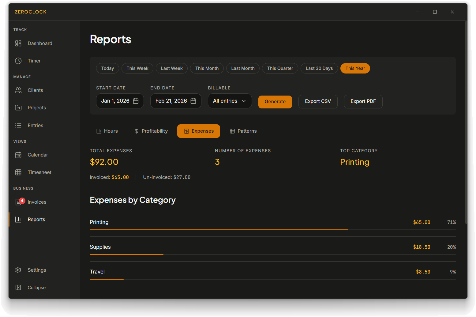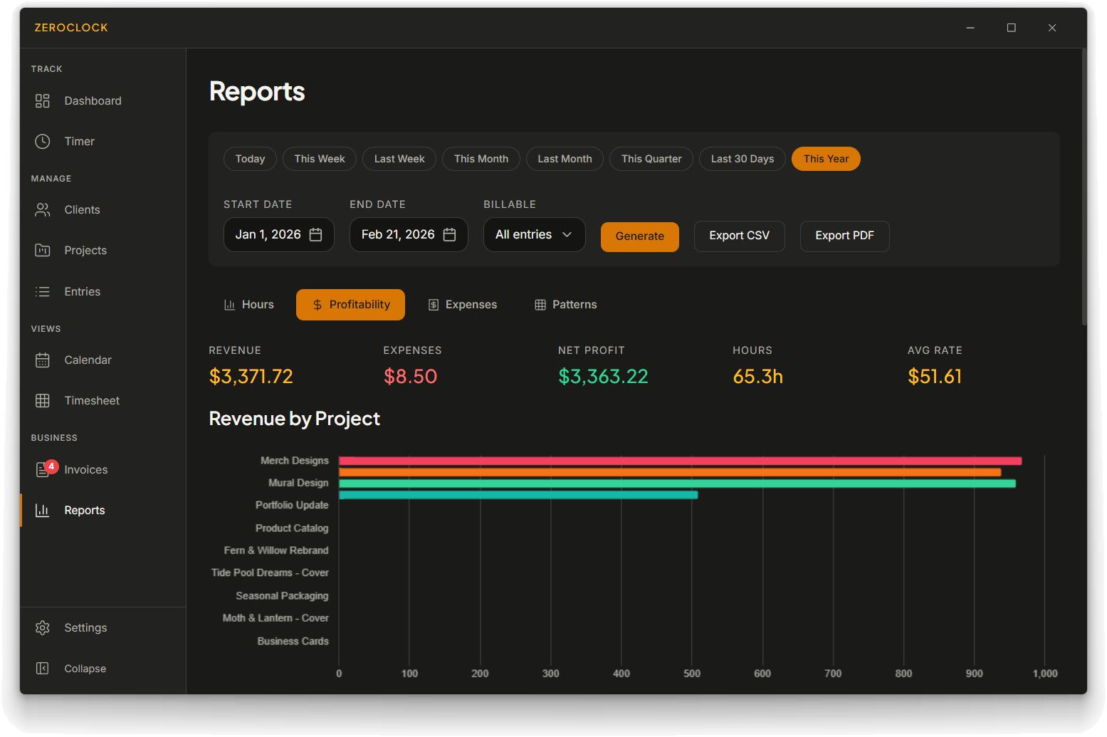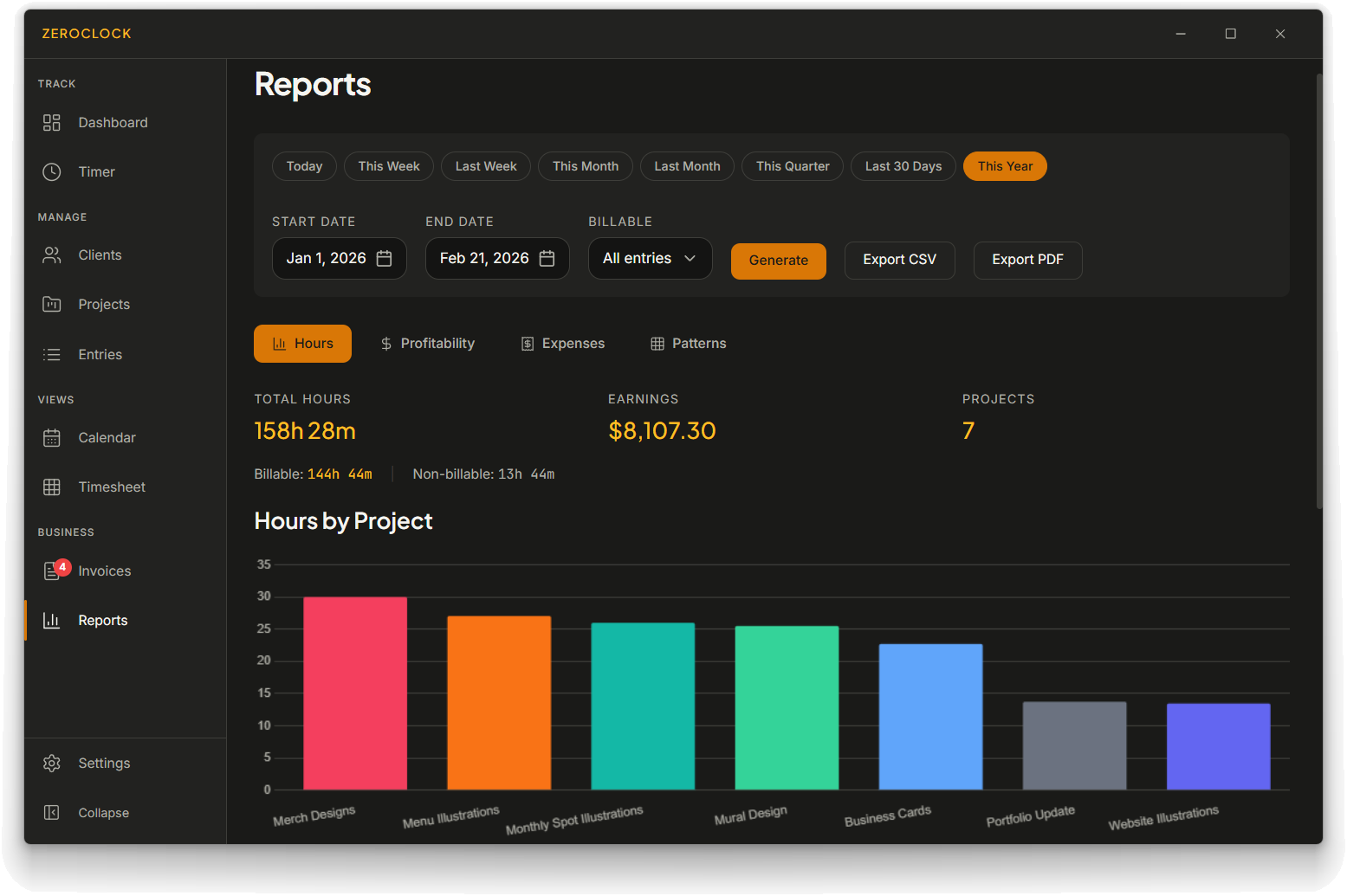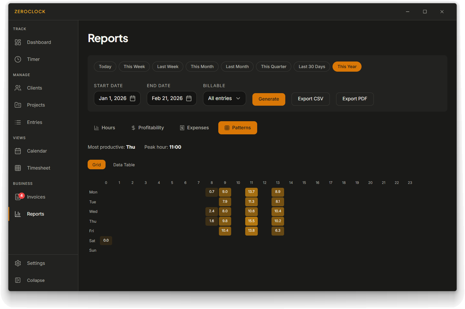 Hours breakdown, profitability analysis, expense tracking, and work pattern heatmaps. Export reports to CSV or PDF.